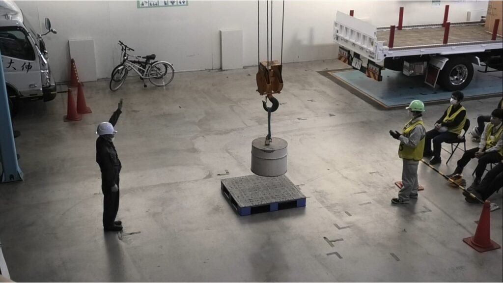 クレーン運転(移動式クレーン含む)は、玉掛け作業者との共同作業であることが一般的です。玉掛け作業者がワイヤーロープやチェーンなどでつり具の取り付け・取り外し、荷物の固定をした上で、玉掛け作業者の合図に従い、目的の場所までクレーンを操作して移動させます。