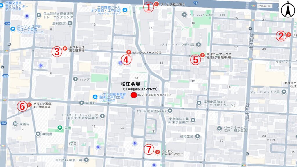 松江会場近隣コインパーキングは下図をご参照ください。2025(令和7)年1月現在
