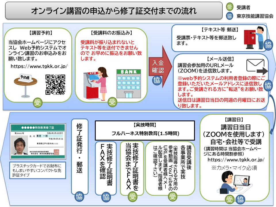 | 対象科目 | フルハーネス特別教育(学科4.5時間) ※実技1.5時間(フルハーネスの使用方法等)は、各事業所様で実施し実技修了証明書を別途ご提出 して頂いてから修了証を発行します。実技修了証明書はテキストと一緒にご郵送致します。 実技ご担当者は条件がございます。詳細はお問合せをお願い致します。 |